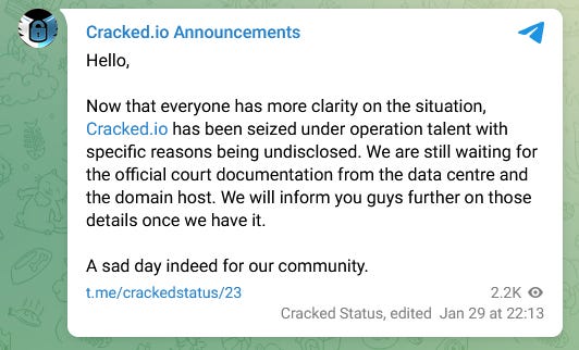 Confirmación. Cracked comunicó en su canal de Telegram la confirmación de la baja del sitio, que se vio afectado por un banner de confiscación. “Ahora que todo el mundo tiene más clara la situación, Cracked fue incautado bajo la Operación Talent, sin que se hayan revelado los motivos concretos”, protestaron.