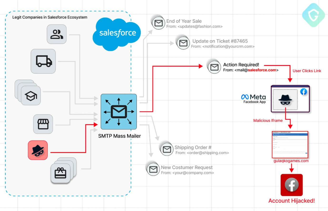 El exploit abusa una falla conocida como “PhishForce” que bypassea las verificaciones de Salesforce y aprovecha las evasiones de seguridad de los filtros que los clientes de mail manejan, al confiar en Salesforce. La compañía de inteligencia publicó un mapa de esta mecánica: