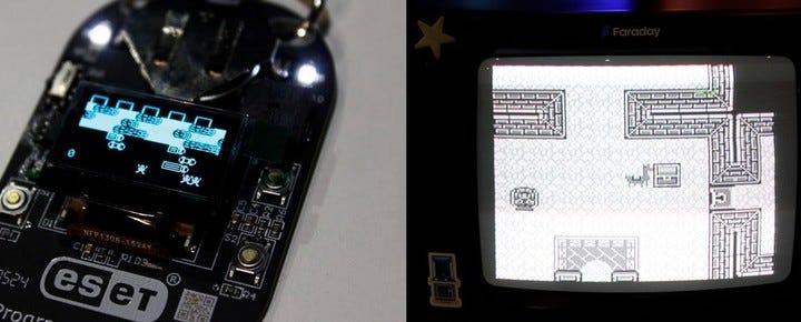 Otras competencias fueron organizadas por las marcas que están presentes en Ekoparty, como ESET que hizo una competencia con un “badge” de premio con un pequeño juego retro, el Frogger. Otra empresa de ciberseguridad, en este caso argentina, Faraday, hizo una competencia de hacking con un juego estilo Game Boy como premio.