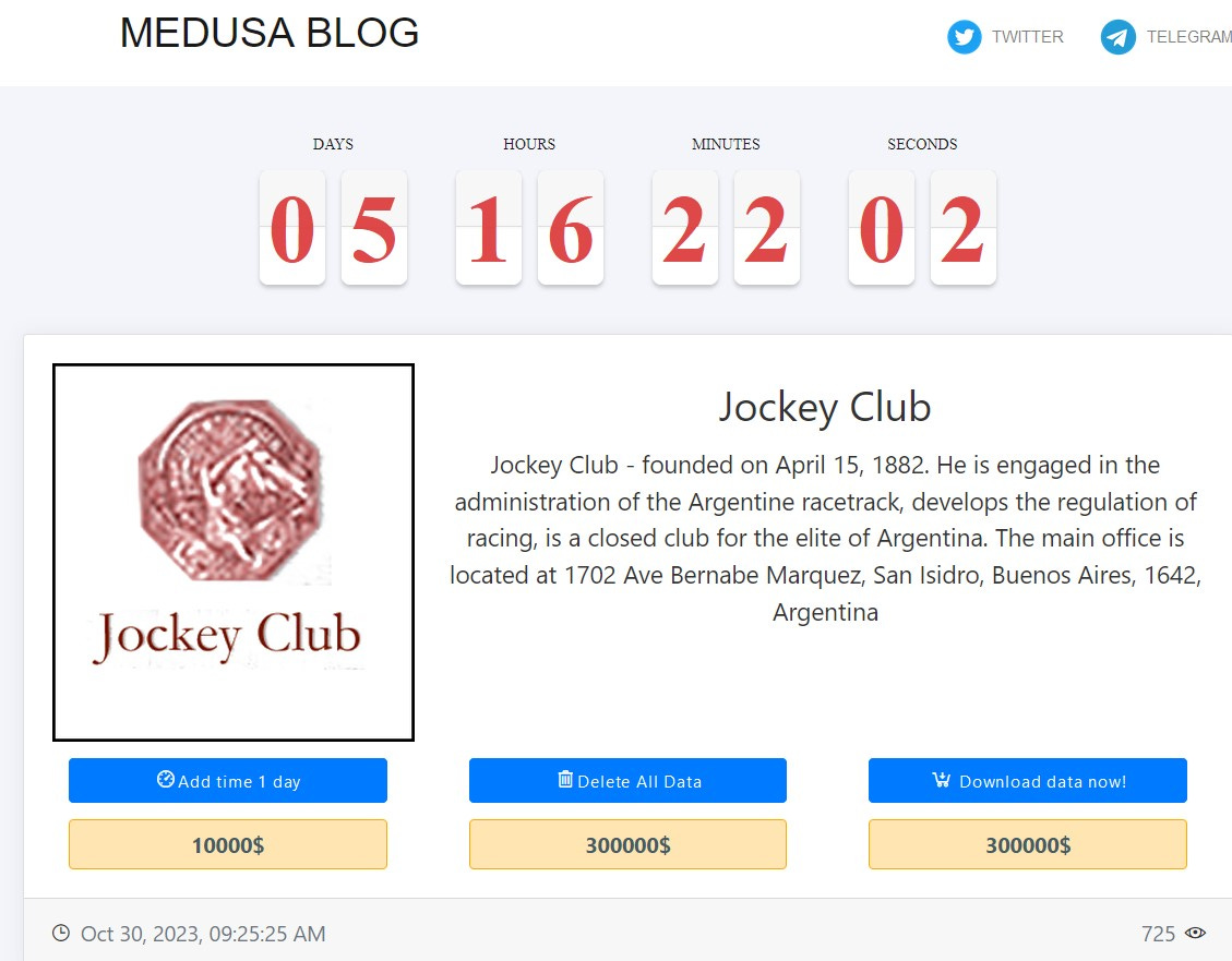 Medusa anunció a Jockey Club como víctima el 30 de octubre de 2023, pidiendo un rescate de 300.000 dólares. Ya habían sido víctimas de Lockbit el año pasado. Los archivos filtrados contienen información financiera contable, presupuestos, pagos y contrataciones, además de un respaldo de nube OneDrive.