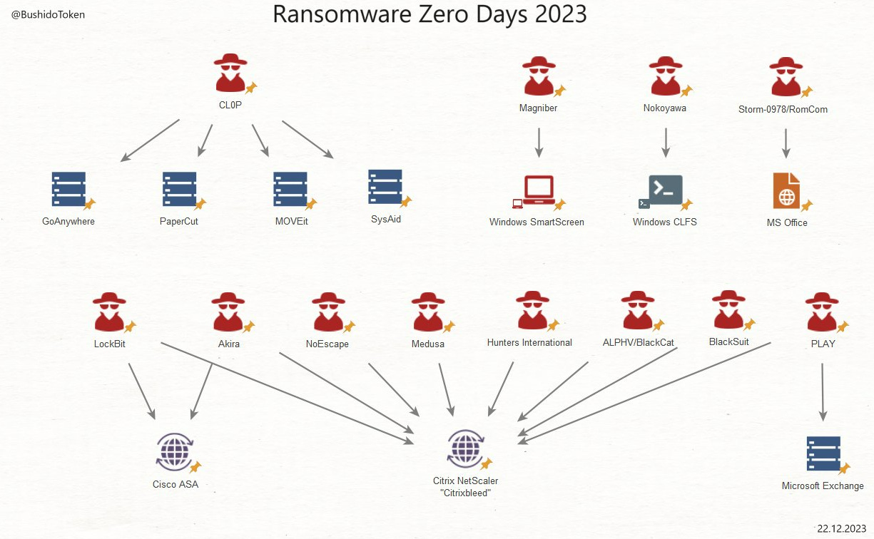 La enorme cantidad de vulnerabilidades de 2023 es otro aspecto que destaca el reporte. En este sentido, el analista Will Thomas publicó esta semana un gráfico que conecta a los principales grupos de cibercriminales y las vulnerabilidades más explotadas:
