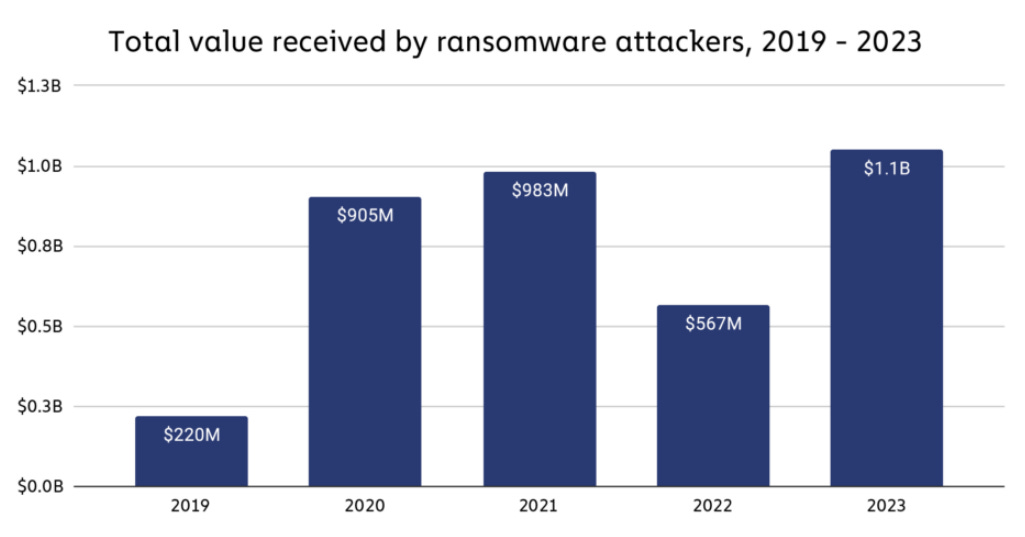 🔒 Los pagos de rescates de ransomware excedieron los mil millones de dólares en cripto en 2023