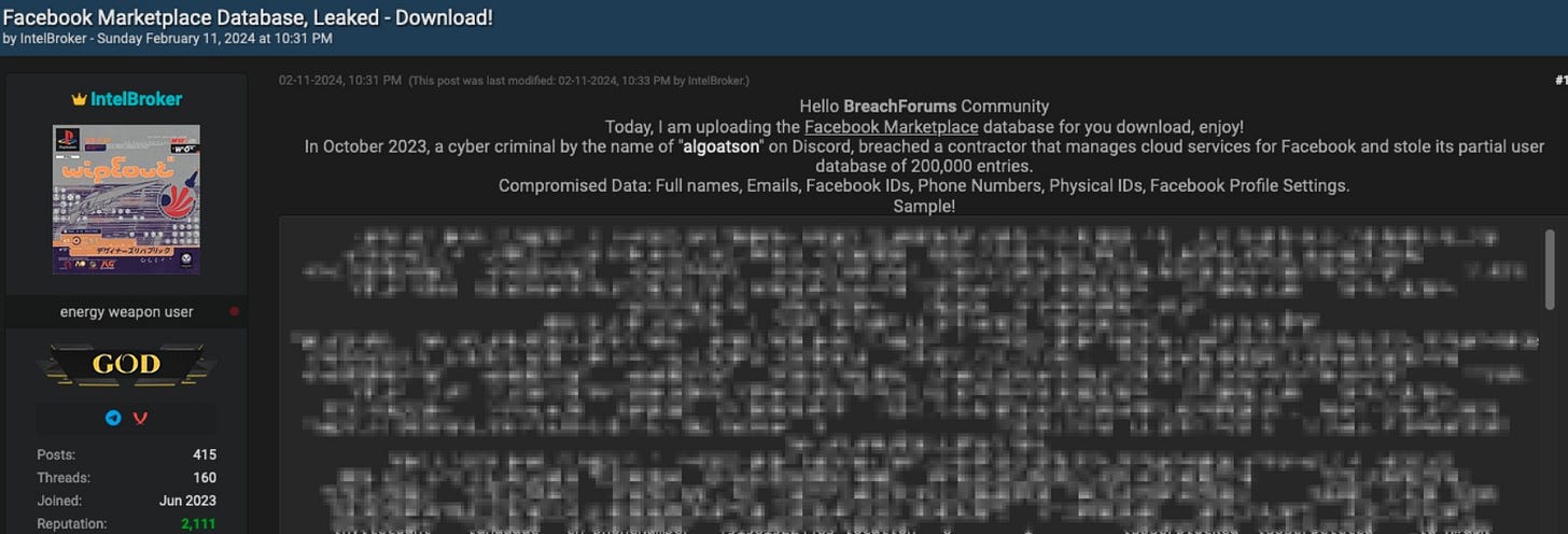 Un actor de amenazas filtró 200 mil registros en un foro de hacking, que contrendría información de identificación, como nombres, números de teléfono, direcciones de correo electrónico, ID's de Facebook e información de perfil relacionada a Facebook Marketplace.