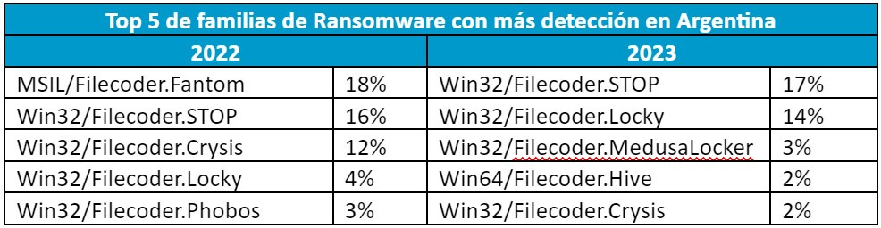 Durante 2023 de acuerdo a la Telemetría de ESET, en Argentina se vieron un 15% menos de archivos diferentes de códigos maliciosos del tipo Ransomware con respecto a 2022; pero en tipos de familias y variantes vimos un aumento del 31%. Si bien hemos visto una disminución en la cantidad de detecciones, hemos sido testigos de una especialización de los mismos, entendida como una variedad más amplia en el tipo de amenazas.