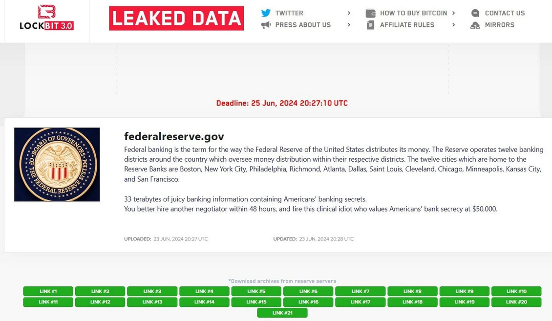 El histórico grupo de ransomware Lockbit, que sufrió un takedown de su sitio a comienzos de año, subió un posteo esta semana en el que aseguraba tener información de la Reserva Federal de los Estados Unidos. Sin embargo, luego se supo que esto no era cierto.