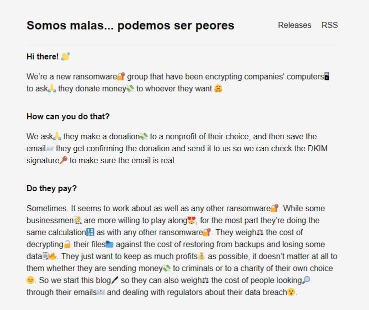 Es raro encontrar esta dinámica entre los grupos de ransomware actuales, que, en general, extorsionan sobre un pago para ellos mismos (y para mantener la estructura cibercriminal). En este ámbito,LockBit cambió la forma de operar con sus afiliados e impuso condiciones más duras de negociación, en tanto el cártel consideró que estaban siendo un poco blandos con los montos que estaban pidiendo. Al margen, como los ataques fueron tantos, los recopilo al final de esta entrega, bajo la sección de Más info.