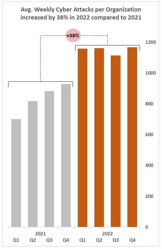 Check Point Research censó el incremento global de los ataques (2021 vs. 2022).